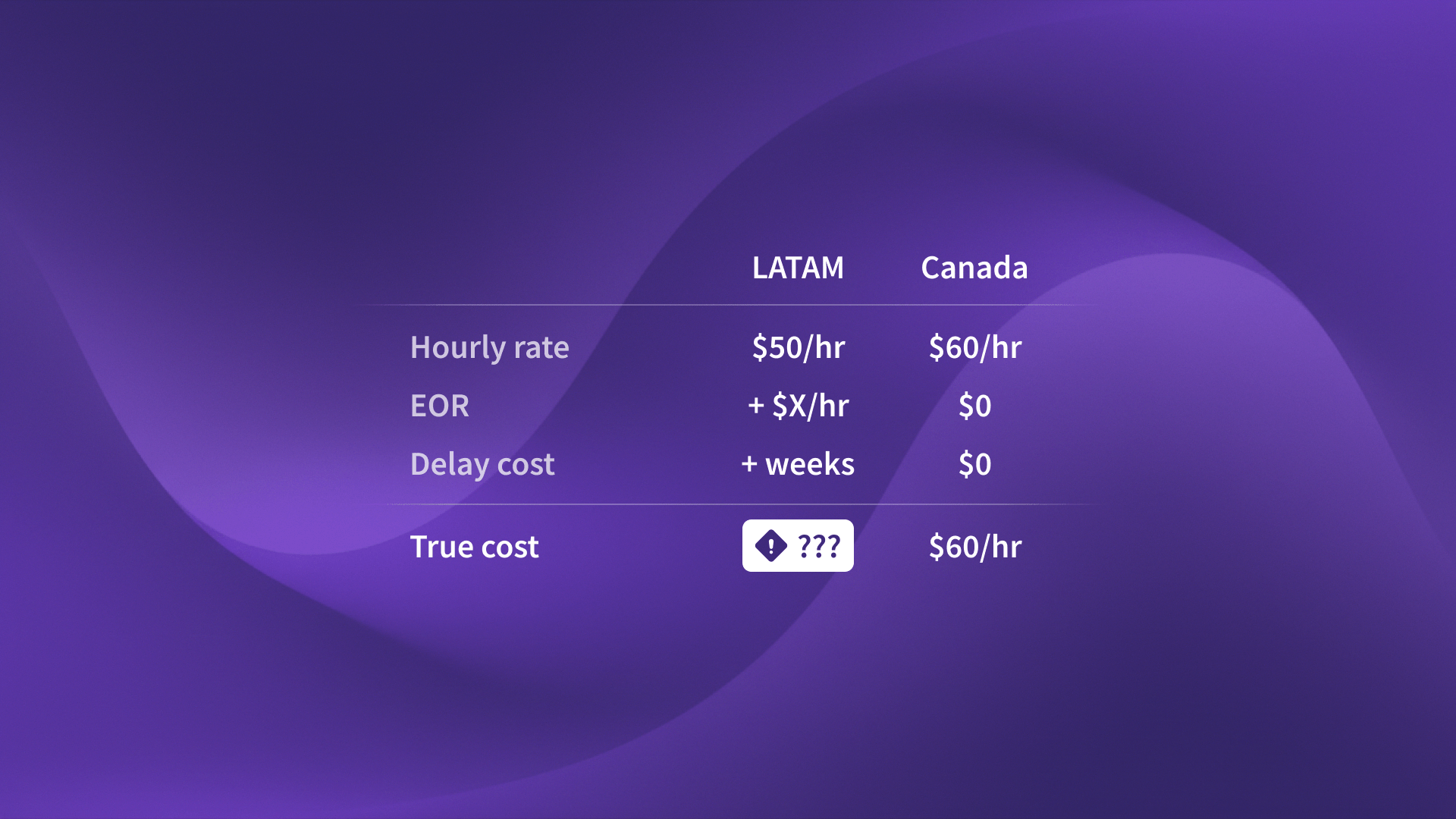 Canadian hires often do not need an EOR. This is due to USMCA trade agreements and legal frameworks similar to the US. The compliance simplicity isn't just a convenience factor. It's a material cost advantage that disappears from hourly rate comparisons but shows up clearly in total compensation analysis.