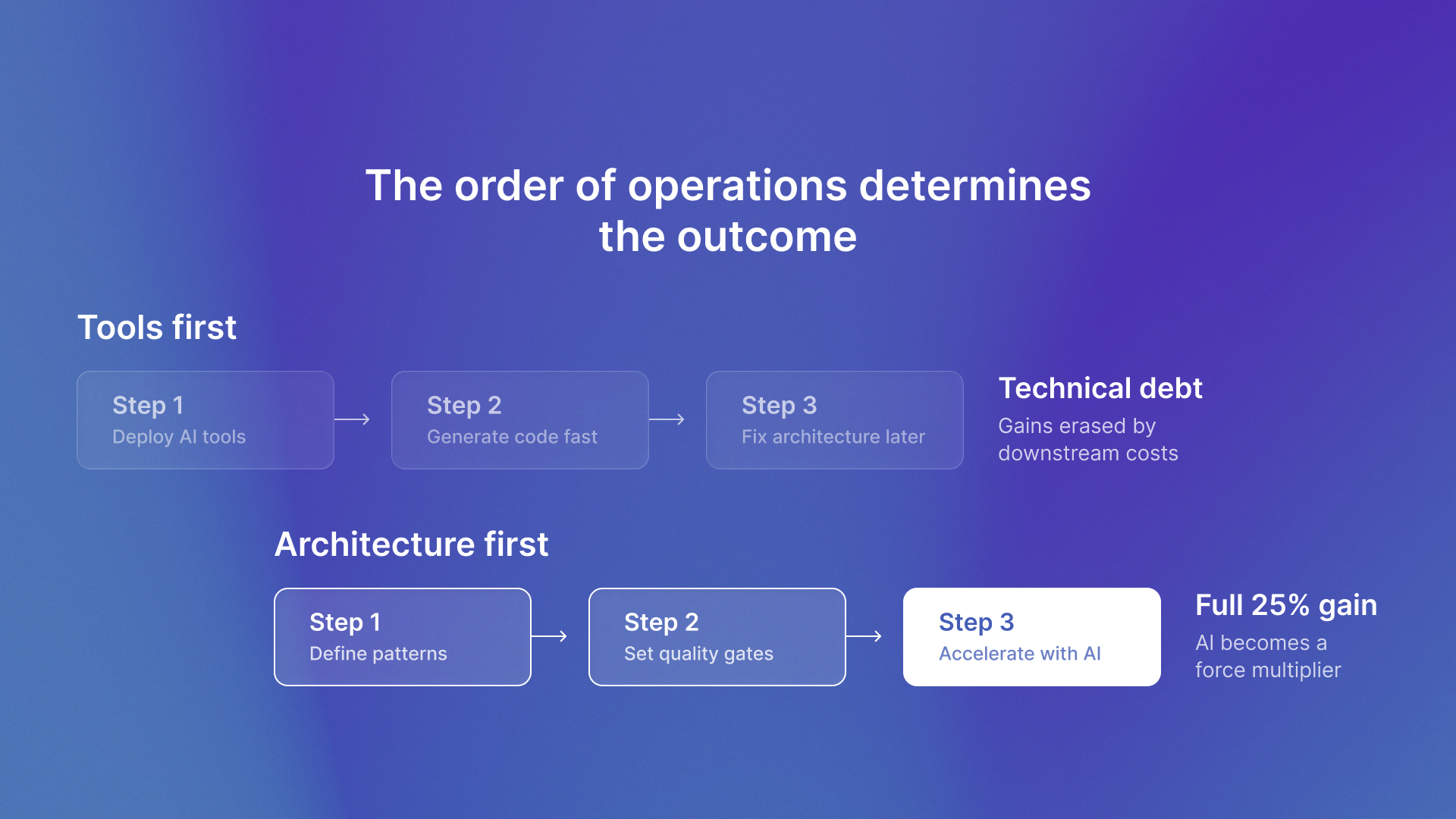 Two situations where faster coding without architectural discipline makes sense. Early-stage startups pre-PMF where speed to market matters more than architectural purity. And companies with exceptional architectural discipline already in place, where AI tools simply accelerate execution of proven patterns. For everyone else, the choice is clear: architect first, then accelerate.