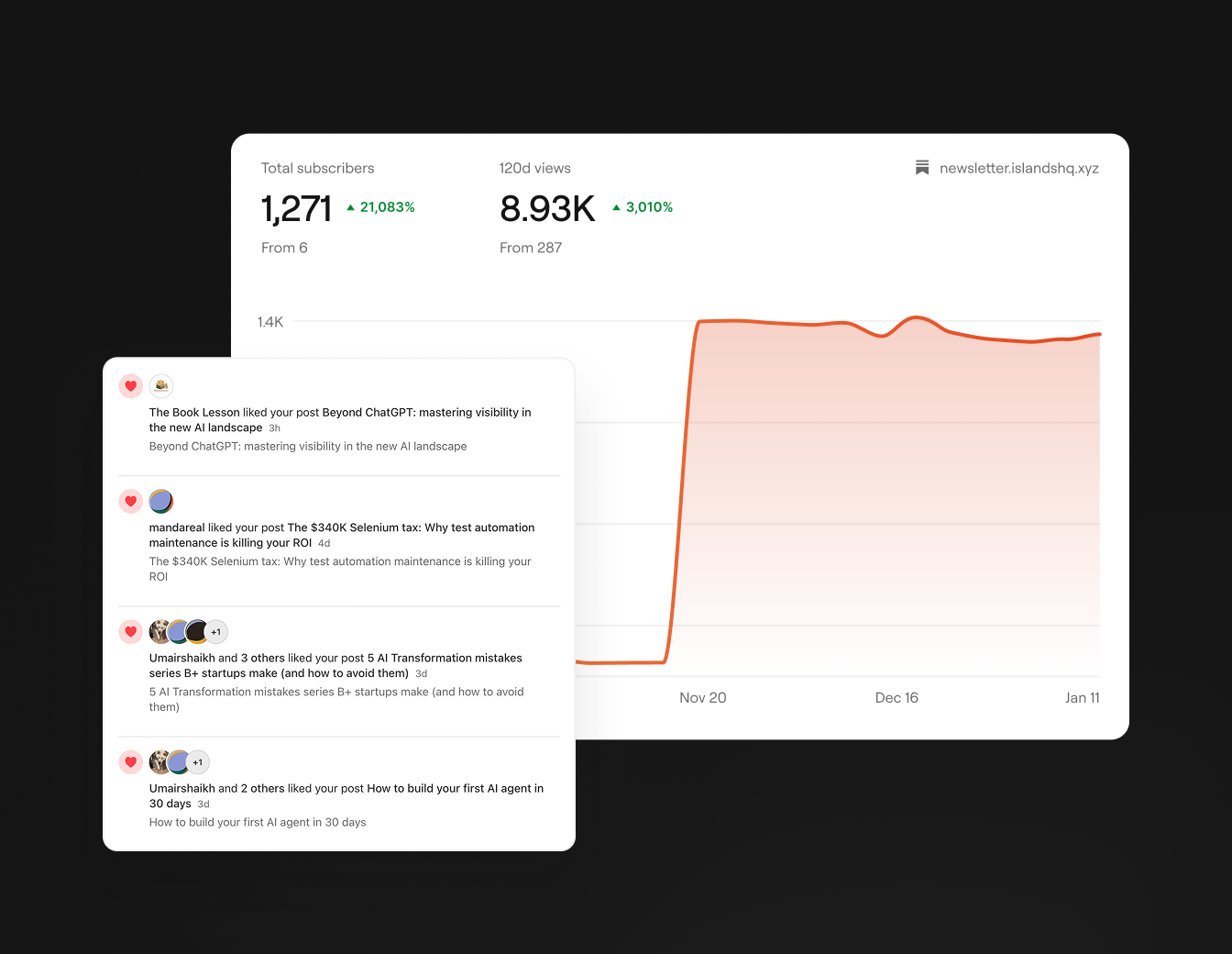 Proven subscriber growth and thousands of organic views on Substack, built entirely on the same workflow we offer you.