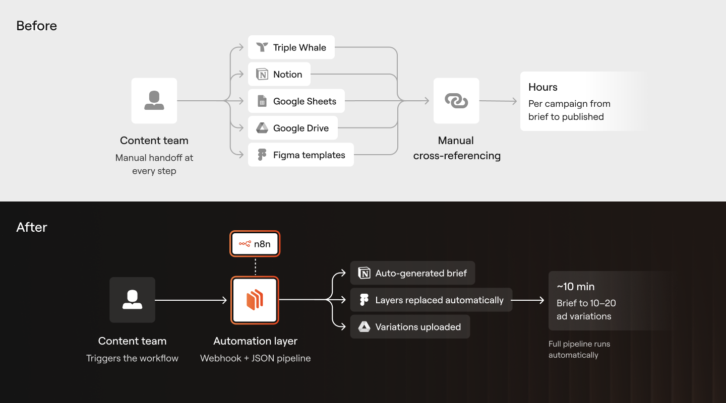 The result cut creative production time from hours to minutes, eliminated manual errors, and freed up design resources for higher-value work, while introducing a scalable process for launching and testing campaigns faster.